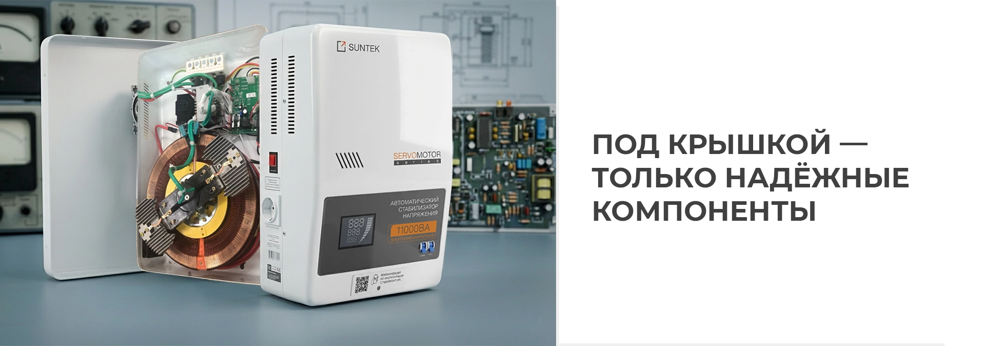 В основе конструкции — проверенная временем электромеханическая схема с сервоприводом, обеспечивающая плавную и точную регулировку выходного напряжения